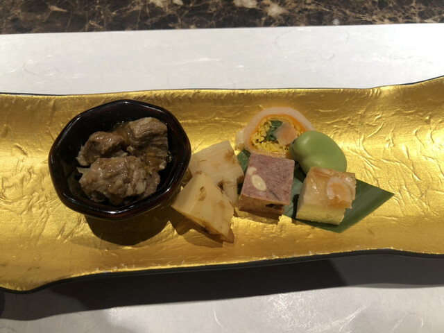 まずは前菜の黒毛和牛の和風出汁煮込み、冷製ですが柔らかくて旨味もしっかりあり、添えられてるキャビアが良い感じに食感と塩気を引き立てています。