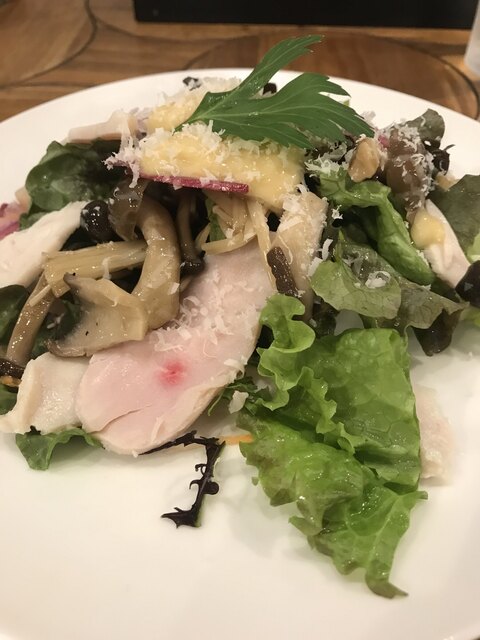 さて、今回は「ペペロンチーノ」な気分だったので「鶏ハムといろいろキノコのサラダ」と「釜揚げしらすとキャベツのペペロンチーノ」のセットを注文。