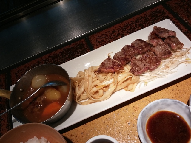 岡半本店の和牛リブロース薄焼き、牛脂煮込み