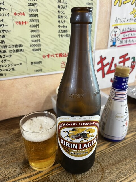 店のお姉さんの計らいで4人掛けテーブルに案内され瓶ビールとお新香、とり、ネギ、ウインナー。