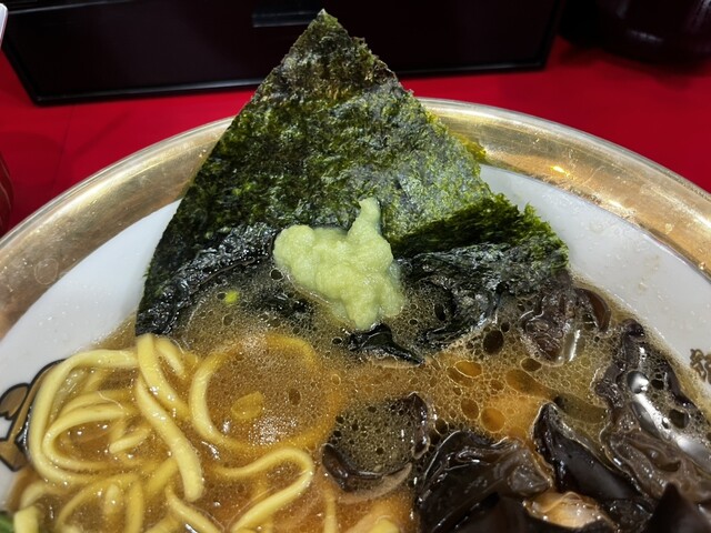 ラーメン内の海苔にニンニクをたっぷり乗せて、麺と一緒にズルズルレッド流!