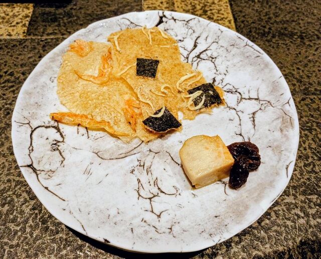 ・酢飯煎餅with鮟肝とレーズン