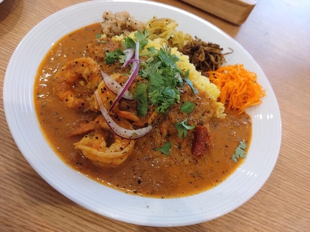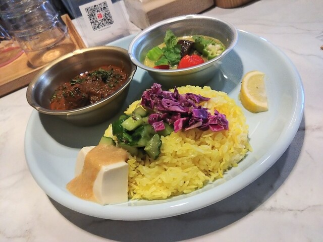 2種あいがけ ラムのビンダルーと夏のベジタブルグリーンカレー