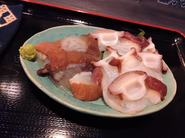 祝1周年 鮟鱇共和え、刺身盛合せ、白レバー山椒炒め 日本酒など