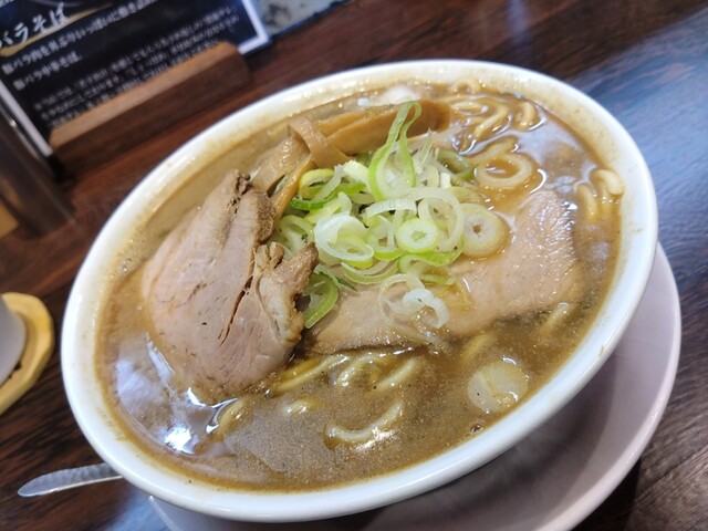極太の短冊切りの柔らかなチャーシュー、キャベツ、きくらげ、豆もやし、玉ねぎなどの青森野菜、ナルト、揚げかまぼこなどが入っています。煮干しと豚骨白湯のスープが塩味に味付けられています。