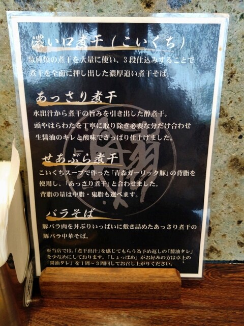 スープは、煮干しを三段仕込みしたスープで、煮干しの旨みがダイレクトに伝わってきますが、ザラザラ感やドロドロ感は皆無でキリッとした青森らしい煮干しです。