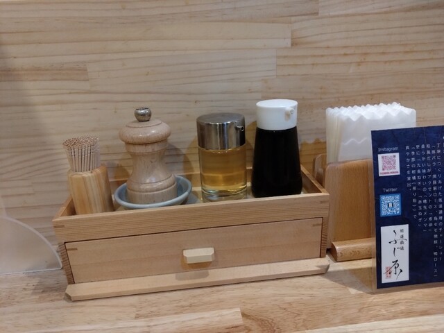 カウンターには木製のお盆が置かれ、箸置きに乗った箸、大きなレンゲがセットされ、スープやトッピングの説明を読み完成を待ちました。