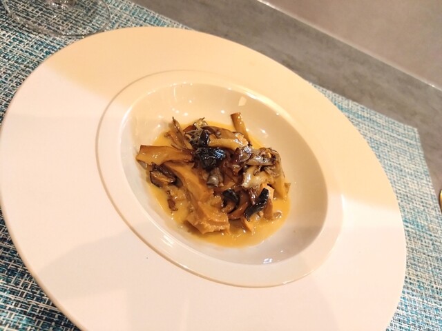 前菜 低温でローストしたキノコ、牛ハチノスのフォンドボー煮込み