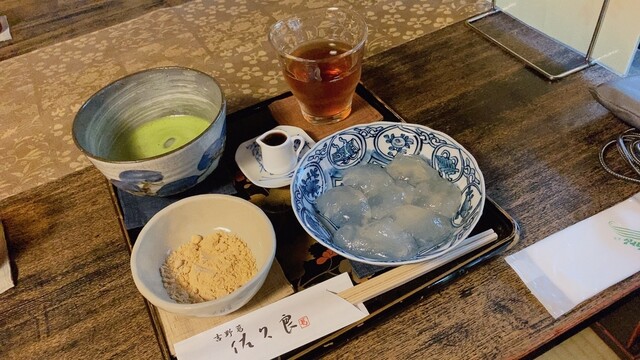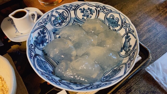 葛もちはほのかに温かく、黒蜜ときな粉をかけて
