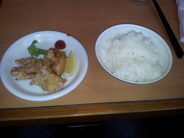 今回はちょっと腹も減っていたんで、ライスと唐揚げセットも併せて注文。
