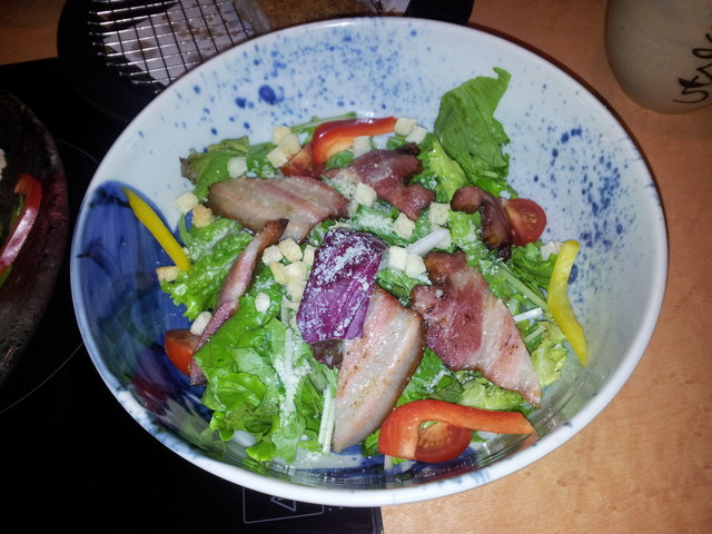 黒豚ベーコンシーザーサラダ、半熟たまごをかき混ぜます。