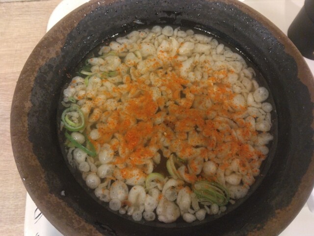 天カスは大手うどんチェーンなどでは入れ放題である場合が多いですが、こちらでは10円かかります。丸っこくて揚げ玉に近い形状で、はなまるうどんさんの揚げ玉に似た形状でした。10円ですが結構な量が入ります。