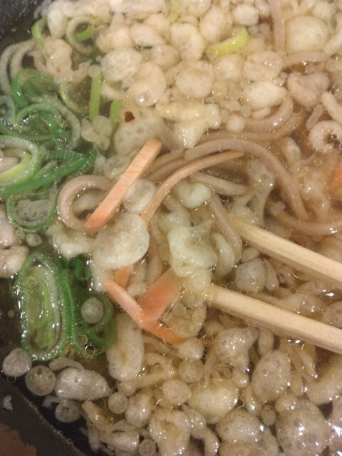 おつゆは関西風のあっさりした薄い色のおつゆ。しかし今回はやや塩辛い気がしました。ダシをとり過ぎたのかもしれませんが、薄味よりこっちの方が美味いです。天カスの油分が入って、油分のコッテリが加わっているのでより好みの味わいに。