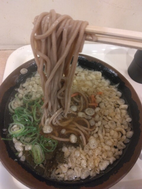 いわゆる駅そばのおそばは冷凍が多いです。このお店がどうかはわかりませんが、どちらにしても茹で置きなのでお世辞にも美味いわけではないですが、やや太めでごわっとしていて、これぞ駅そばの雰囲気。麺量もそんなに多くは無く、するっと食べてするっと出られる早飯仕様になっております。