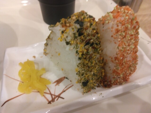 1個だと90円、2個だと170円と10円分安くなります。海苔が付いていない代わりに違う種類のふりかけがしっかり掛かっています。キレイな三角形ですが、硬めに握られていて米は潰れ気味。冷たくなっていてそんなに美味しくはないのですが、不思議と悪くない感じ。漬物もちょっとだけ添えられています。