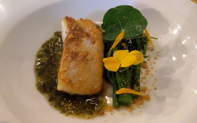 メイン:青森産平目のムニエルに近隣で採れた脇芽ブロッコリー添え。蕪ベースで青海苔を加えたスープで分厚い平目を頂きます。脇芽ブロッコリーは山菜の様な風味でミントも良いアクセントになっています