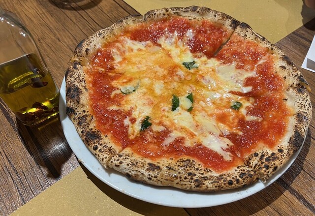 マルゲリータはコースのデザートの前に挟んで頂きました。ビックリなのがフライパンで調理。シェフはピザ専門店出身とのことで熟知しており、どんなオーブンでもピザ窯の温度400℃台に達しないので、強火の蓋をしたフライパンなら可能で周囲の焦げ目だけバーナーで付けるという工夫。クリスピーなピザとして愛されるのも納得。とうがらしオイルの相性は抜群、お試しあれ。