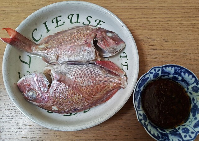 二か月ほど前に篠島沖で釣った小型の真鯛二匹(25cmと28cm)が冷凍庫に