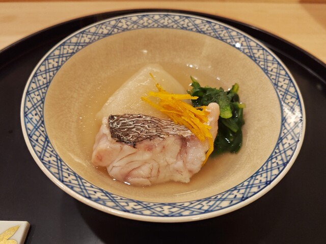 炊き合わせは聖護院蕪と甘鯛。上品な甘鯛の旨味が上手く引き出されている。若干濃い目の