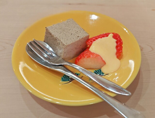 水菓子はフルーツソースの掛かった苺と黒豆のババロア。一見してよくある黒ゴマのババロアかと
