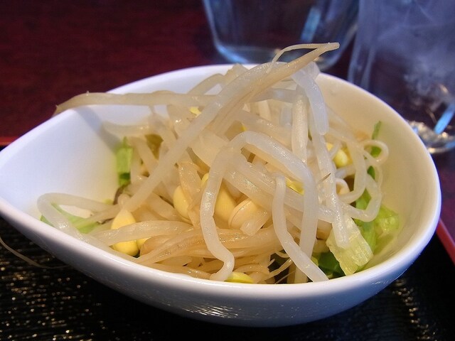 そして陳麻婆豆腐は玉子スープ、漬物、もやしのサラダみたいなのがセットになってます