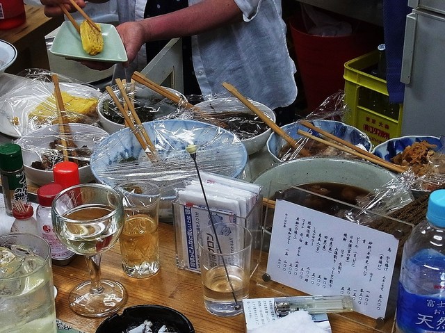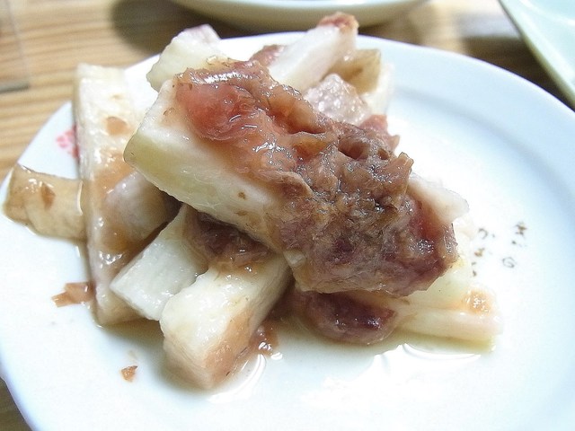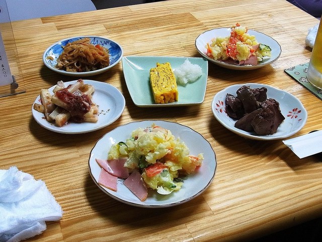 ポテトサラダ、山芋の梅肉和え、玉子焼き、レバ、切り干し大根を選んで席に戻ります