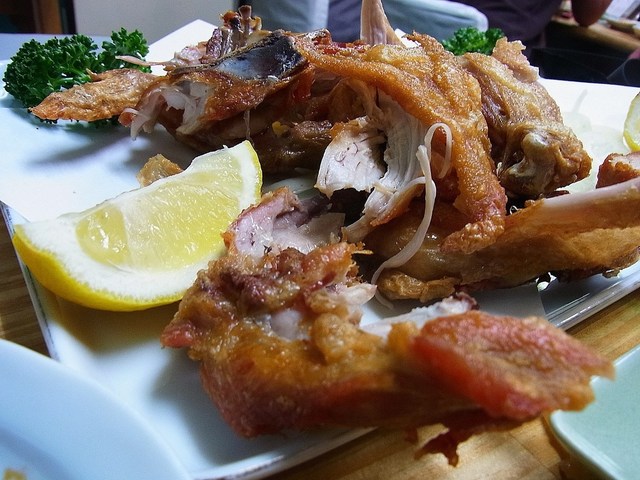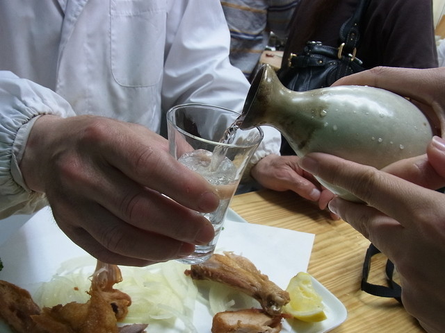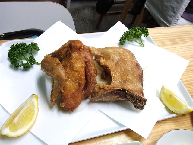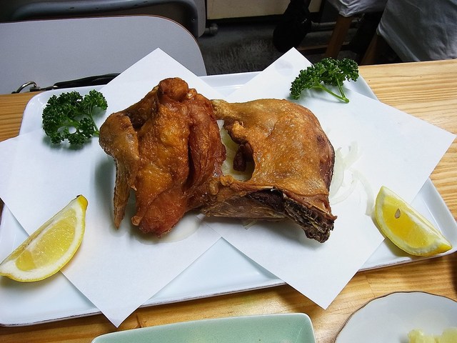 それでは名物の鳥の唐揚げ(素揚げ)ムネ、モモ各600円をセット(1200)で頼みます