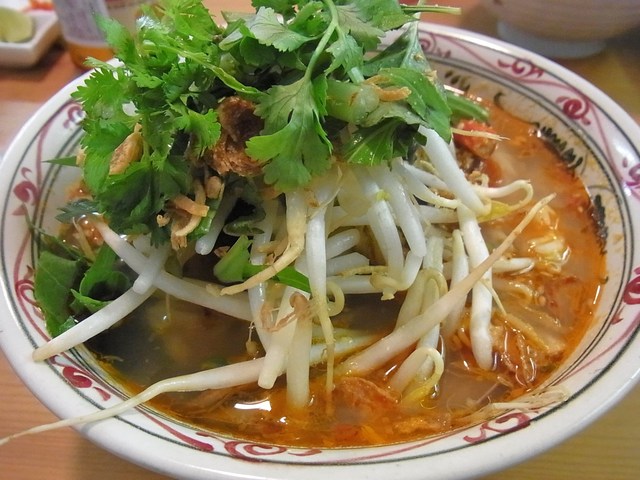 そしてコム・ヘンですがこれにもパクチーにもやしが沢山です少し赤いスープをすすると
