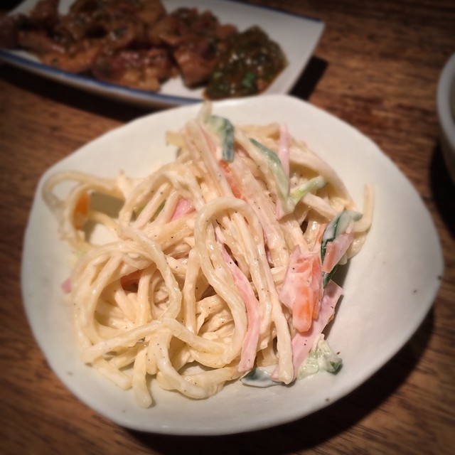 スパゲティーサラダにねぎを塩とタレ一本ずつ頼んで更にハイッピーもセットで酔い酔い(笑