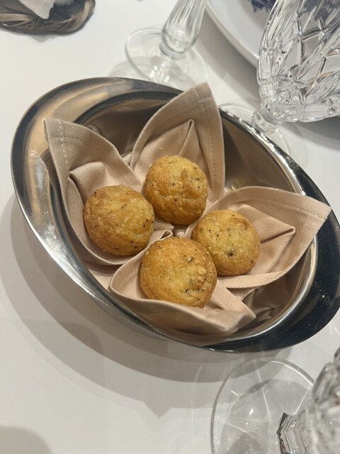 アミューズ、前菜2種類、メイン1種類、デザート、コーヒーまたは紅茶、お茶菓子、パンお代わり自由と盛り盛りのコース。