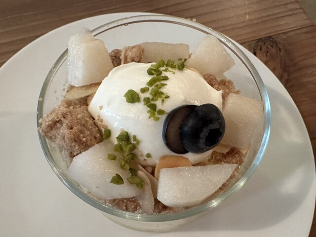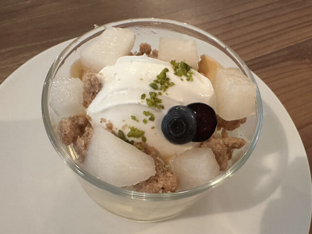 梨ゼリー、こちらの梨ゼリー爽やかで梨の美味しさが楽しめる。
