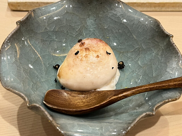 1つ目は鱈の白子で和えたシャリにフグの白子が乗っかった鮨(どう見ても握りとは言えない)。想像できるだろうか。フグの白子は私が知っている最高の食べ方である、軽く炙ってある状態。スプーンで頂くのだが、フグの白子はやはり箸で千切って頂く方が良いような気がする。当然箸で千切ると中はトロ〜リ。改めてスプーンを手に取りシャリと一緒に口へ運ぶ。これで鮨。味は説明の必要は無だろう。フグの白子の炙ったものを経験された方は、想像通りなのだが、鱈の白子の酢飯(つまり混ぜたもの)がフグの白子と合わさってこそ鮨。そしてその味は?これは説明する事が難しい。簡単に言えば、鱈の白子の味はフグの白子の邪魔をしない。では、ただ普通の酢飯ならばどうか?ここからが分からなくなる。想像してほしいが、フグの白子を御飯と一緒に食べるか?つまり、フグ料理を食べる時、最後に雑炊があるので、生まれてから一度もご飯と食べた事がない。鮨なので軍艦巻きであん肝、鱈の白子のはあるかもしれないが、フグの白子は「仄かさ」「上品さ」があると考えている。もしかしたら、単にフグの白子を酢飯に乗せて起きてしまう不自然さを、鱈の白子と酢飯を和えた事で、味の調和を狙ったのではないか?この1貫(一皿?)の「調和」は炙ったフグの白子の「暖かさ」と「常温」の鱈の白子を和えた酢飯、「仄かで上品な味」と「多少きつめで濃厚さが口に残る味」、そして「白子つながり」の共演と酢飯の「酢」のアクセントで構成された味なのである。