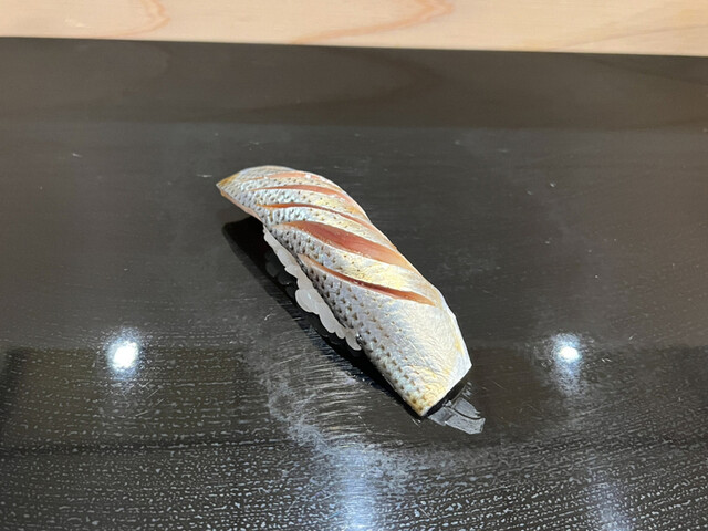 骨切りの包丁が入っているためか煮切りが身に細かく入り込んだ状態のチョット見慣れない寿司をおもむろに口に運ぶ。噛みしめ、味わうとジワっとくる旨味。どんな味?と言われても、タイやブリの様な分かりやすいと言うか特徴のある味では無い。身質は寿司ネタの一般的な物とは異なりフワっとした弾力を感じる。常連さんから、美味しいネタとは少し違うでしょうと声をかけられたが、その通りで、未知の食感と味。