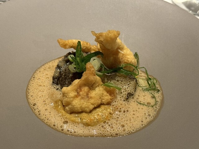 オマール海老の唐揚げは加熱して味を活性化させる時に衣でエキスを閉じ込めてしまう効果が発揮されているからであろうが、とにかく味が深い、同系統の味のソースがうまく調和して、エスプーマの泡が舌を適度に刺激してくれて味わいを深めてくれている様な感覚になる。