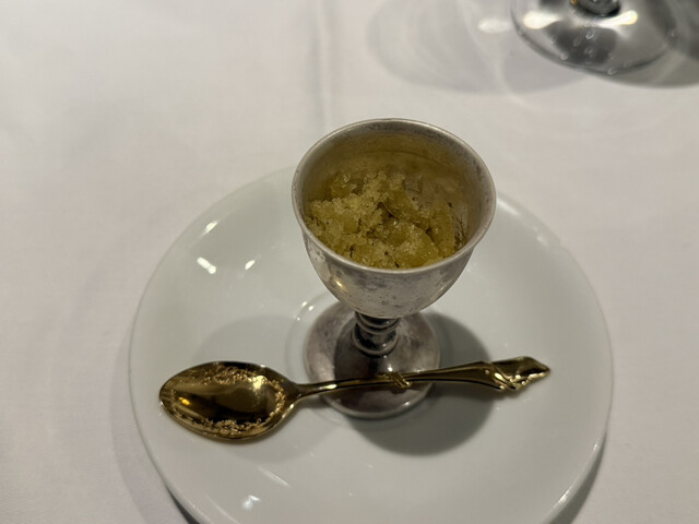 これをどうやって頂こうかと一瞬迷ったが、一気に口に入れる事にして実行。私が期待したのは雲丹の味と香りだったのだが、この一品はそう単純な物では無いと思い知る。いかにも雲丹と言う味はしない。そもそも桜肉と雲丹の組み合わせの味をどう言うイメージでまとめると言うのか?これが美味しくなければ何だこれは、となるが美味しいのだから、どの様に?と言う話になる。おかしな話だが未知の味。そしてソースが付いたキャロットラベのシャキシャキ食感と味が襲ってくるので、わずかスプーン1杯で一口の料理なのに箸休め迄付いた一口料理!と言う事に。