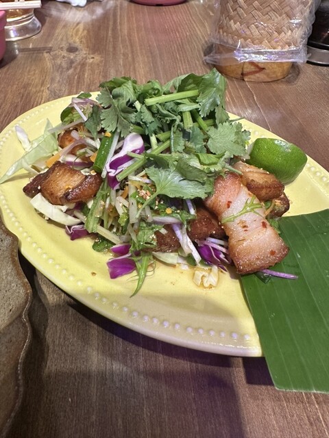 炭水化物から逃げようとして野菜系を頼んでもカオニャオの誘惑に負けて一個半餅米を食べて後悔するラオラオ。