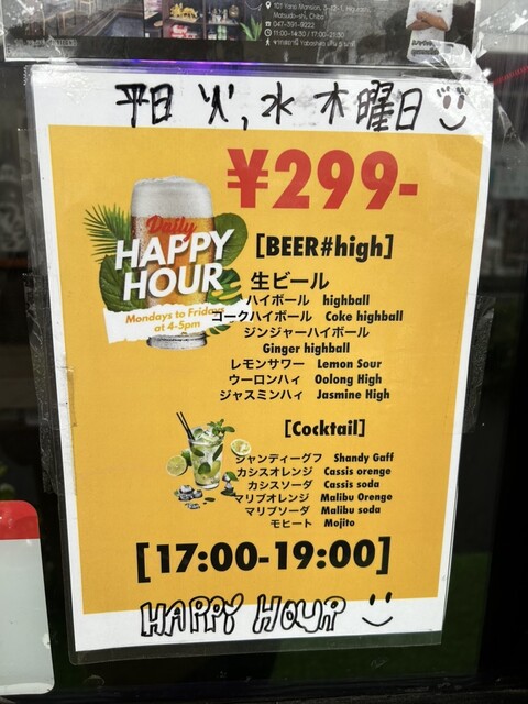 ちなみに火水木の17時19時でハッピーアワーがあるそうです。