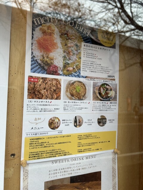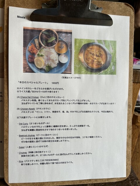 本日のスペシャルプレート1650円 左手のカラヒを選択肢。右のサツマイモダルカレーとその他の副菜などは共通