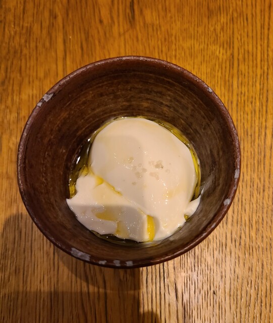 デセールはそば茶のブランマンジェ。柔和なクリーム感の中からそば茶の落ち着いたトーンの香りが静かに立ち上がります。てっぺんにカマルグの塩がちょこっとあしらわれていて、これがぜんざいの塩昆布よろしく、甘味を引き立てるのに一役買っています。そしてオリーブオイルも張られていて、この組み合わせが意外と相性良かったりして。