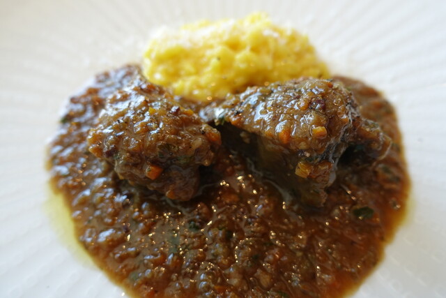 和牛ホホ肉の煮込み グレモラータ風味 リゾットミラネーゼ添えにしました。