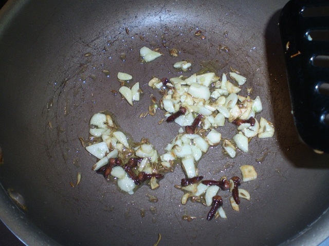 粒クローブ、ニンニク、ちょっと経ってから玉ねぎのざく切りを投入。