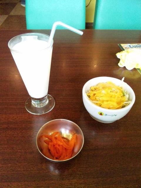 サラダは相変わらずの黄色っぽいソース、ラッシーは割りと甘味が強く、