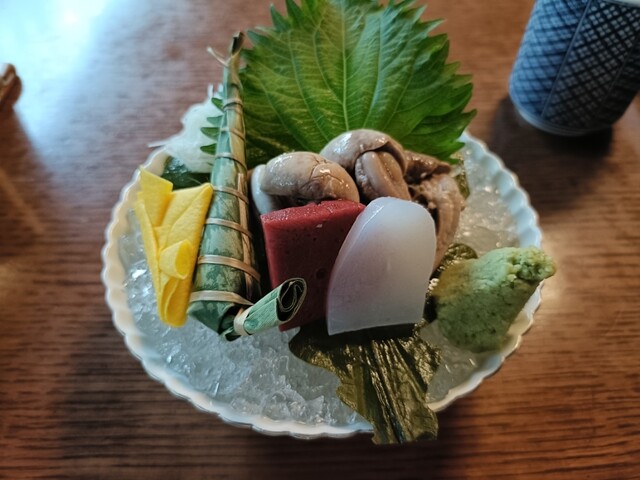 きもわさは紅白の刺身こんにゃくと薄焼き卵で作られた兜帽子、わさびに彩られ刺盛りと見紛う華やかさでした。