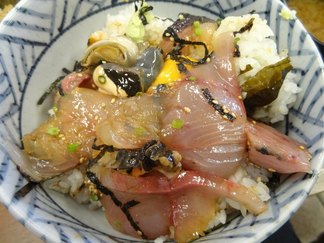 皿に盛られたこの日の漬けはイナダ、アオダイ、サザエでした。