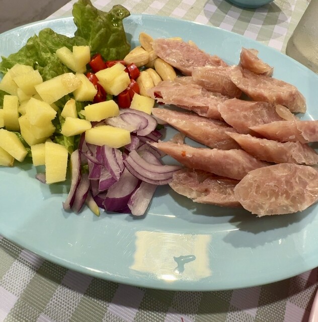ソーセージの事です。酸味のあるソーセージに刻みチリ、生姜、タマネギ、