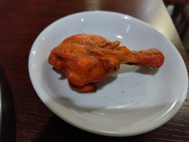 Cランチセット(1319円)にタンドリーチキンを1ピース(274円)オーダーしました。2種類選べるカレーは、チキンマサラとシーフードカレーにしました。ドリンクはマンゴーラッシーを、辛さは中辛にしました。