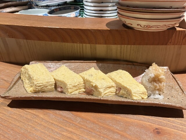 またお酒のつまみで明太子入り玉子焼きをお願いしました。トロトロで口の中でトロっととけて明太子のアクセントが美味しかったです。