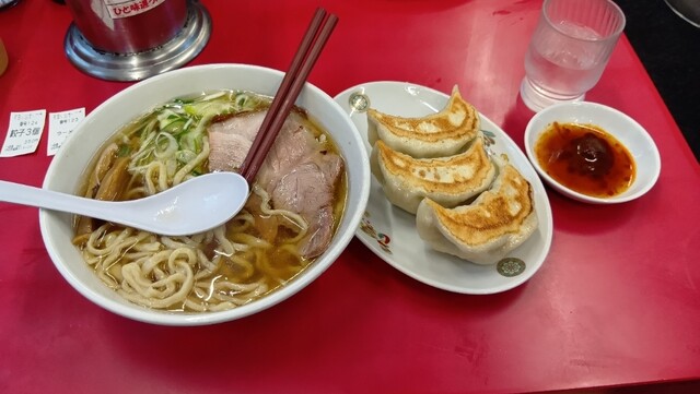 宿泊したホテルの周辺案内に小山市で1番有名と紹介されてました。12時に行くと、15人位外で並んでました。先に店入口で食券を買ってから並びます。しばらくすると10人位中に通され、次行けそうな感じ。中でも少し待ちましたが、15分程度で着席。¥1000ラーメンと¥300餃子3個頼みました。着席から5分でラーメン来ました。ビジュアルは普通のラーメンですが、チャーシューが厚め、ネギ大きめカット、メンマ太めです。写真ではスープ濃そうでしたが透き通ってます。スープは…さっぱりだけど動物系と節系の深い旨味がたまらん。麺は平打コシある麺です。ヤバシ美味し。最高に好きな味。メンマは柔らかく、スープと調和味付け控えめ。チャーシューは厚めですが程よい食感と脂身で味付け控えめラーメンと調和。マジ美味し。幸せ。餃子は1個がデカい。5個にしなくて良かった。皮厚くモッチリ具だくさん。ちと辣油入れすぎて辛い。汗出ました(^_^;)でも美味くて箸が止まりません。名店ご小山市にまた一つあることを知りました。ご馳走でした。
