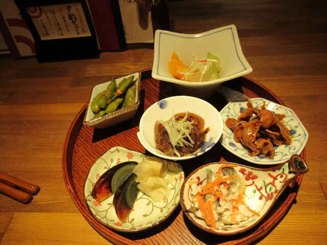 夕酌セット(アテ5種+利き酒セット+1ドリンク)+お通し 1,793円(^^)b