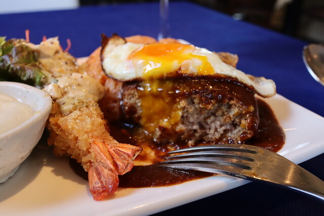 大きなまぁるい煮込みハンバーグにデミグラスソース、半熟の目玉焼きの黄身の三重奏は罪。